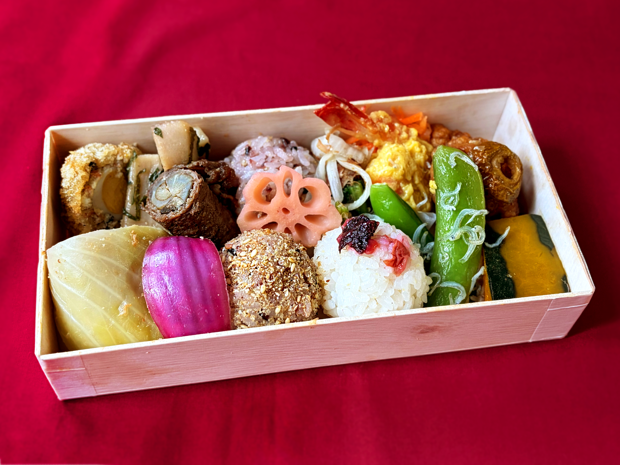 おにぎり(白米(国産)、赤米(国産)、梅干し、ごま、ちりめん、食塩)、ロールキャベツ(キャベツ、豚ひき肉、玉ねぎ、ぶなしめじ、清酒、鶏卵、食塩、中濃ソース、有機ケチャップ、こしょう)、スコッチエッグ(うずら卵、おから、かつお・昆布出汁、人参、パン粉、清酒、みりん、薄口醤油、なたね油、小麦粉、乾燥ひじき)、から揚げ(鶏肉、清酒、片栗粉、濃口醤油、鶏卵、穀物酢、きび糖、山査子、ごま油、なたね油、生姜、にんにく、香辛料)、南瓜旨煮(南瓜、かつお・昆布出汁、きび糖、みりん、清酒、薄口醤油、濃口醤油)、ごぼうの肉巻き(牛肉、ごぼう、清酒、みりん、濃口醤油、きび糖、なたね油、唐辛子)、海老の黄身煮(ブラックタイガー、鶏卵、なたね油、かつお・昆布出汁、みりん、清酒、薄口醤油、片栗粉、小麦粉、食塩)、ちりめん炒め(スナップエンドウ、清酒、ちりめん、なたね油、食塩)、人参ラペ(人参、大根、オリーブ油、穀物酢、きび糖、乾燥りゅうがん、食塩)、紫蘇蓮根(蓮根、みりん、薄口醤油、大葉、なたね油)、酢蓮根(蓮根、穀物酢、梅酢、きび糖)、新玉ねぎのおかか和え(玉ねぎ、小松菜、薄口醤油、花鰹、ごま油、穀物酢)、酢漬け (赤玉ねぎ、穀物酢、きび糖、食塩)、(一部にえび・小麦・卵・牛肉・ごま・大豆・鶏肉・豚肉・りんごを含む)