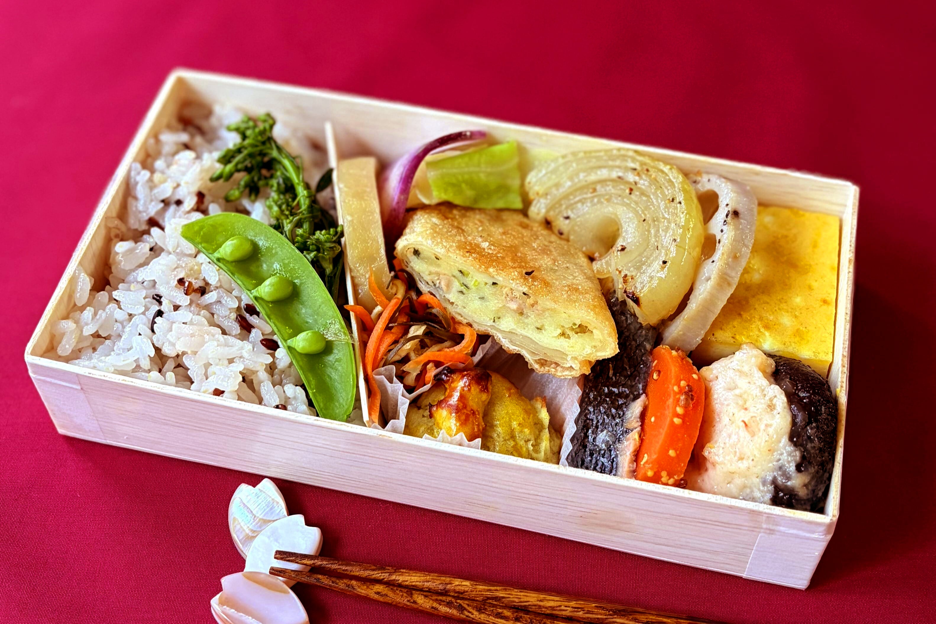 古代米ご飯(白米(国産)、赤米(国産)、緑米(国産))、大根のおでん煮(大根、かつお・昆布出汁、みりん、濃口醤油、薄口醤油)、春巻き(じゃがいも、春巻きの皮、マグロ水煮フレーク、マヨネーズ、こまつな、食塩)、鮭の塩焼き(鮭、食塩)、スイートポテト(さつまいも、牛乳、バター、鶏卵、きび糖)、玉子焼き(鶏卵、かつお・昆布出汁、みりん、薄口醤油、きび糖、食塩、なたね油)、えびしんじょう(えそすり身、かつお・昆布出汁、ブラックタイガー、乾しいたけ、薄口醤油、みりん)、春キャベツのバター蒸し(キャベツ、バター、にんにく、薄口醤油、食塩、こしょう)、グリル野菜(れんこん、玉ねぎ、オリーブ油、食塩、こしょう)、バターグラッセ(にんじん、粒マスタード、きび糖、バター、食塩)、あちゃら漬け(穀物酢、人参、切干大根、きび糖、みりん、濃口醤油、昆布、唐辛子)、菜の花の醤油洗い(菜の花、濃口醤油、食塩)、スナップエンドウ、紫大根、食塩、 (一部にえび・小麦・卵・乳成分・さけ・大豆・りんごを含む)