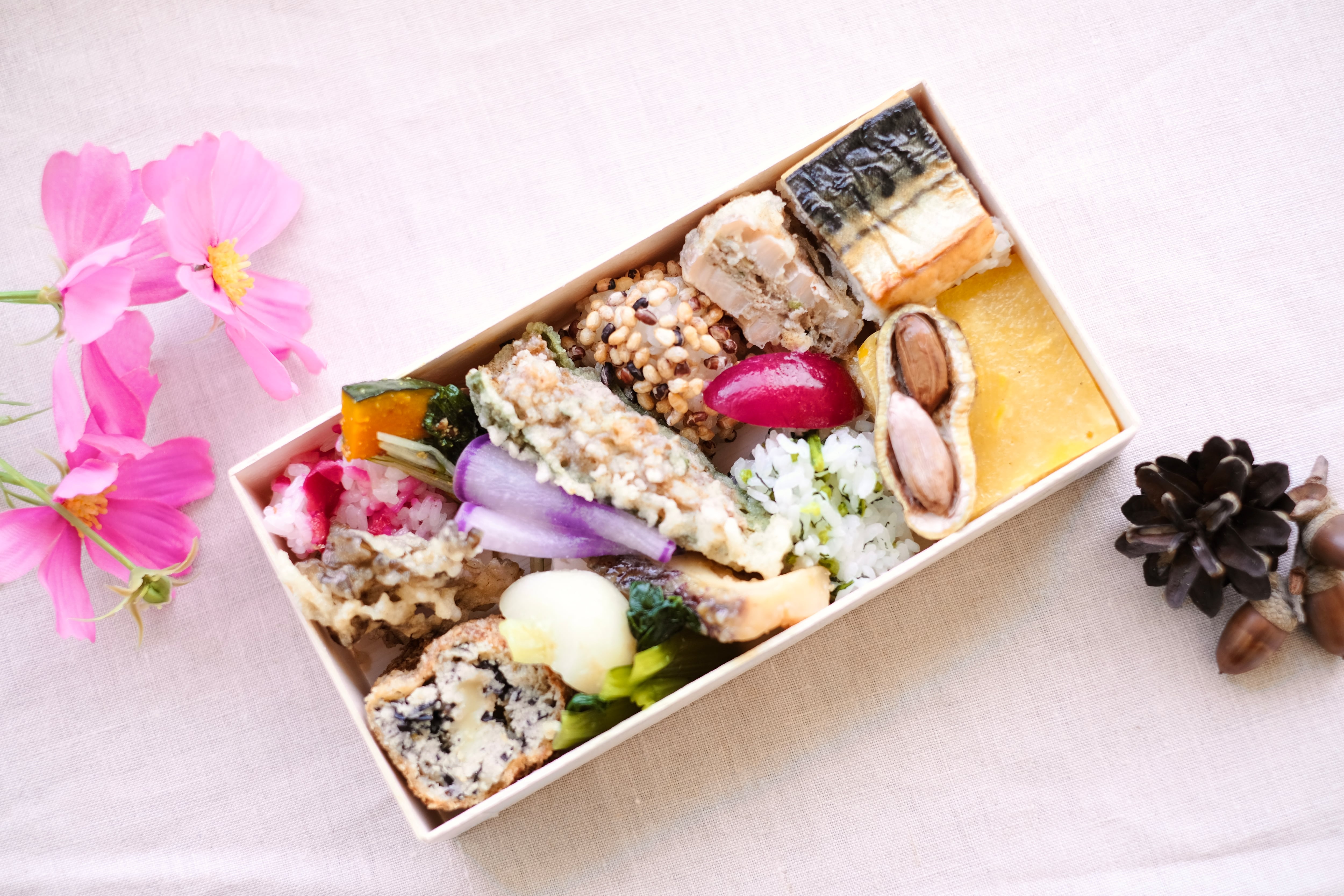 おにぎり3種(白米(国産)、大根葉、梅干し、玄米あられ、食塩、かつお節)、鯖ずし(塩さば、白米(国産)、穀物酢、きび糖、ごま、しそ、しょうが、食塩、昆布)、卯の花コロッケ(おから、鶏がらだし、チーズ、ながいも、ねぎ、清酒、みりん、きび糖、薄口醤油、パン粉、乾燥ひじき、小麦粉、鶏卵、なたね油、食塩、濃口醤油)、はさみ揚げ(れんこん、豚ひき肉、たまねぎ、鶏卵、なたね油、ねぎ、小麦粉、片栗粉、食塩、ごま油、こしょう)、甘長唐辛子肉詰め(豚ひき肉、甘長とうがらし、たまねぎ、鶏卵、なたね油、ねぎ、小麦粉、片栗粉、食塩、ごま油、こしょう)、玉子焼き(鶏卵、かつお・昆布だし、薄口醤油、みりん、きび糖)、南瓜のサラダ(かぼちゃ、みずな、オリーブ油、穀物酢、きび糖、マスタード、食塩、こしょう)、鯛の西京焼き(真鯛、調合みそ、みりん、清酒、きび糖、薄口醤油)、大学芋(さつまいも、上白糖、なたね油、ごま)、舞茸の天ぷら(舞茸、片栗粉、小麦粉、なたね油、鶏卵、食塩)、和え物(こまつな、かつお・昆布だし、薄口醤油、みりん)、大根スープ煮(大根、鶏がら出汁、みりん、薄口醤油、きび糖、食塩)、落花生、ラディッシュ、食塩、(一部に小麦・卵・乳成分・落花生・ごま・さば・大豆・鶏肉・豚肉・やまいもを含む)