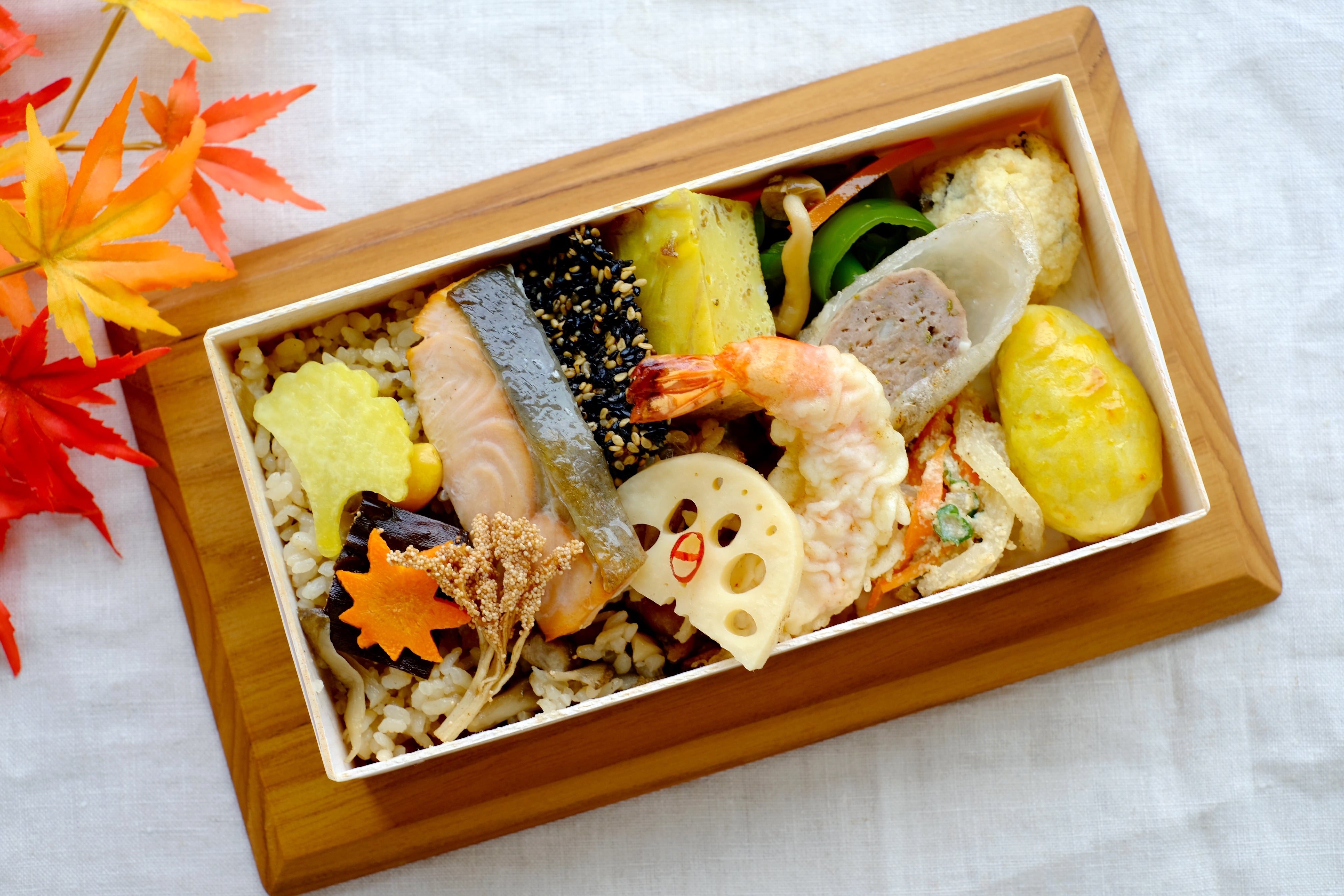 炊き込みご飯(白米(国産)、かつお・昆布だし、ごぼう、鶏肉、まいたけ、ごぼう、ぎんなん、さつまいも、にんじん、昆布、けしの実、こいくちしょうゆ、うすくちしょうゆ、鶏卵、清酒、きび糖、みりん、なたね油、食塩)、鮭の塩焼き(鮭、清酒、食塩)、スイートポテト(さつまいも、牛乳、きび糖、鶏卵、バター)、手作りソーセージ(豚ひき肉、ライスペーパー、なたね油、食塩、きび糖、洋酒、香辛料)、ささみのごま揚げ(鶏ささ身、ごま、鶏卵、なたね油、食塩、こしょう)、ひりょうず(木綿豆腐、かつお・昆布だし、たけのこ、こいくちしょうゆ、みりん、きび糖、片栗粉、きくらげ)、海老天(ブラックタイガー、鶏卵、なたね油、片栗粉、小麦粉、清酒、食塩)、酢レンコン(れんこん、穀物酢、きび糖、食塩、唐辛子)、煮びたし(ピーマン、かつお・昆布だし、にんじん、ぶなしめじ、みりん、うすくちしょうゆ、こいくちしょうゆ)、玉子焼き(鶏卵、かつお・昆布だし、清酒、うすくちしょうゆ、みりん、ふのり)、ぬたあえ(だいこん、にんじん、すりごま、穀物酢、こねぎ、調合みそ、きび糖、食塩)、(一部にえび・小麦・卵・乳成分・ごま・さけ・大豆・鶏肉・豚肉を含む)