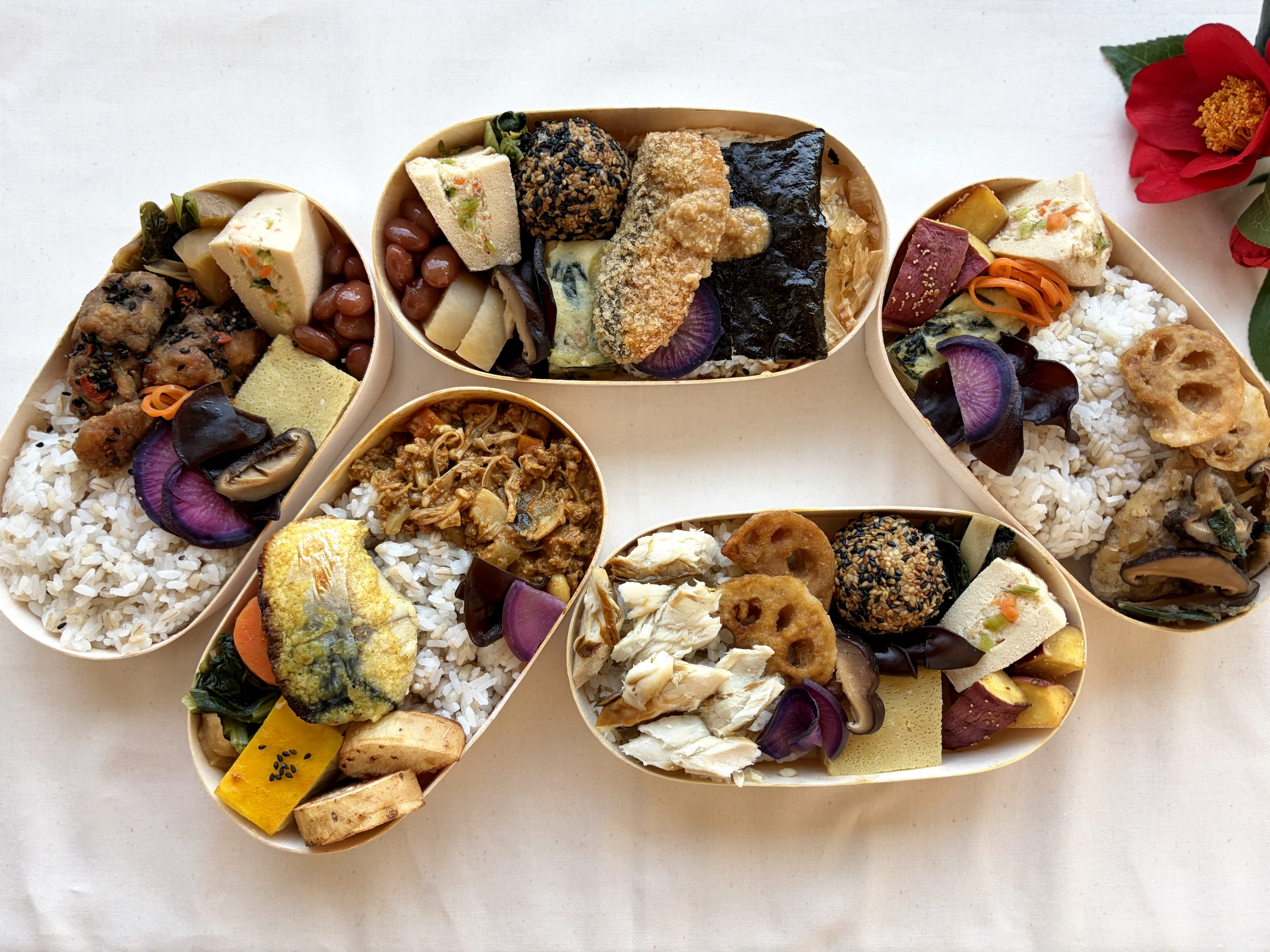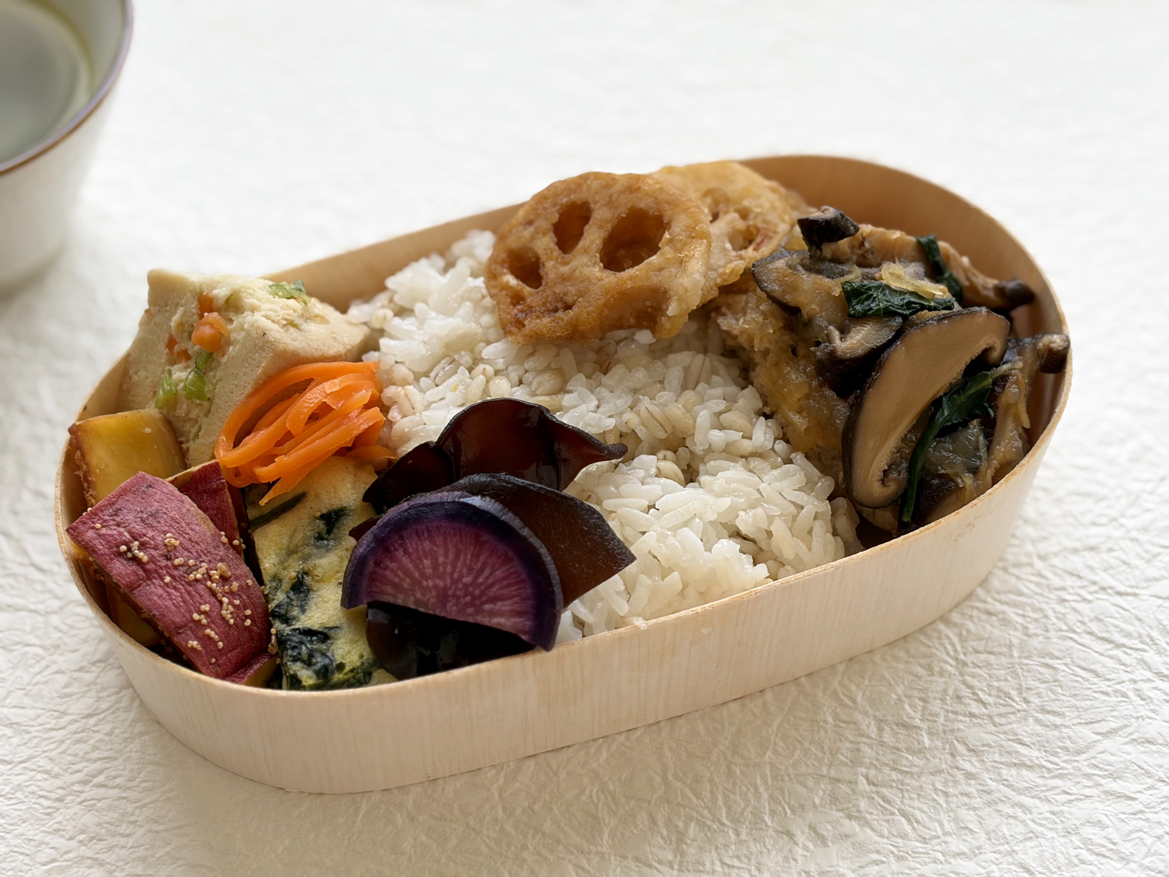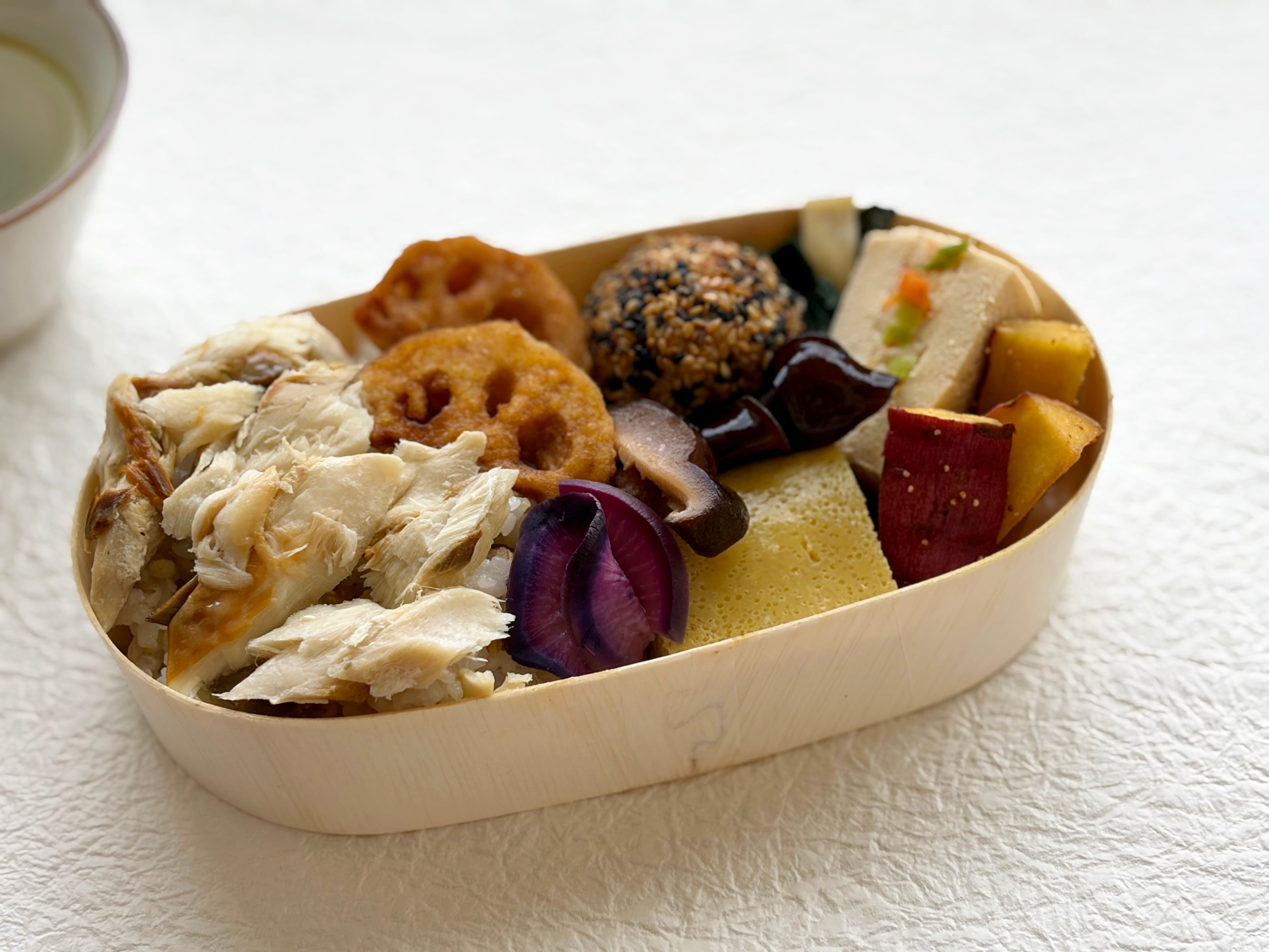 海苔おかかご飯(精白米(国産)、精白麦(国産)、花鰹、焼きのり、こいくちしょうゆ、みりん)、鮭フライ(鮭(北海道産)、しょうゆ麹、清酒、なたね油、パン粉、鶏卵、小麦粉、食塩、こしょう)、里芋胡麻団子(さといも、ごま、片栗粉、花鰹、うすくちしょうゆ、食塩)、射込み煮(えそすり身、高野豆腐、かつお・昆布だし、おから、木綿豆腐、みりん、うすくちしょうゆ、だいこん葉、にんじん、しょうが、なたね油、片栗粉、きび糖、食塩)、ひじき煮入り玉子焼き(鶏卵、かつお・昆布だし、にんじん、みりん、なたね油、清酒、乾燥ひじき、きび糖、三つ葉、こいくちしょうゆ、食塩)、大根煮(だいこん、かつお・昆布だし、こいくちしょうゆ、みりん、ごま油、きび糖)、小松菜と干し大根の含め煮(こまつな、干し大根、かつお・昆布だし、みりん、うすくちしょうゆ、ごま油)、椎茸と木耳佃煮(乾燥しいたけ、乾燥きくらげ、しょうが、こいくちしょうゆ、きび糖、みりん、清酒)、酢の物(紫大根、穀物酢、きび糖、食塩)、煮豆(金時豆、きび糖、食塩、みりん)、(一部に小麦・卵・さけ・ごま・大豆を含む)