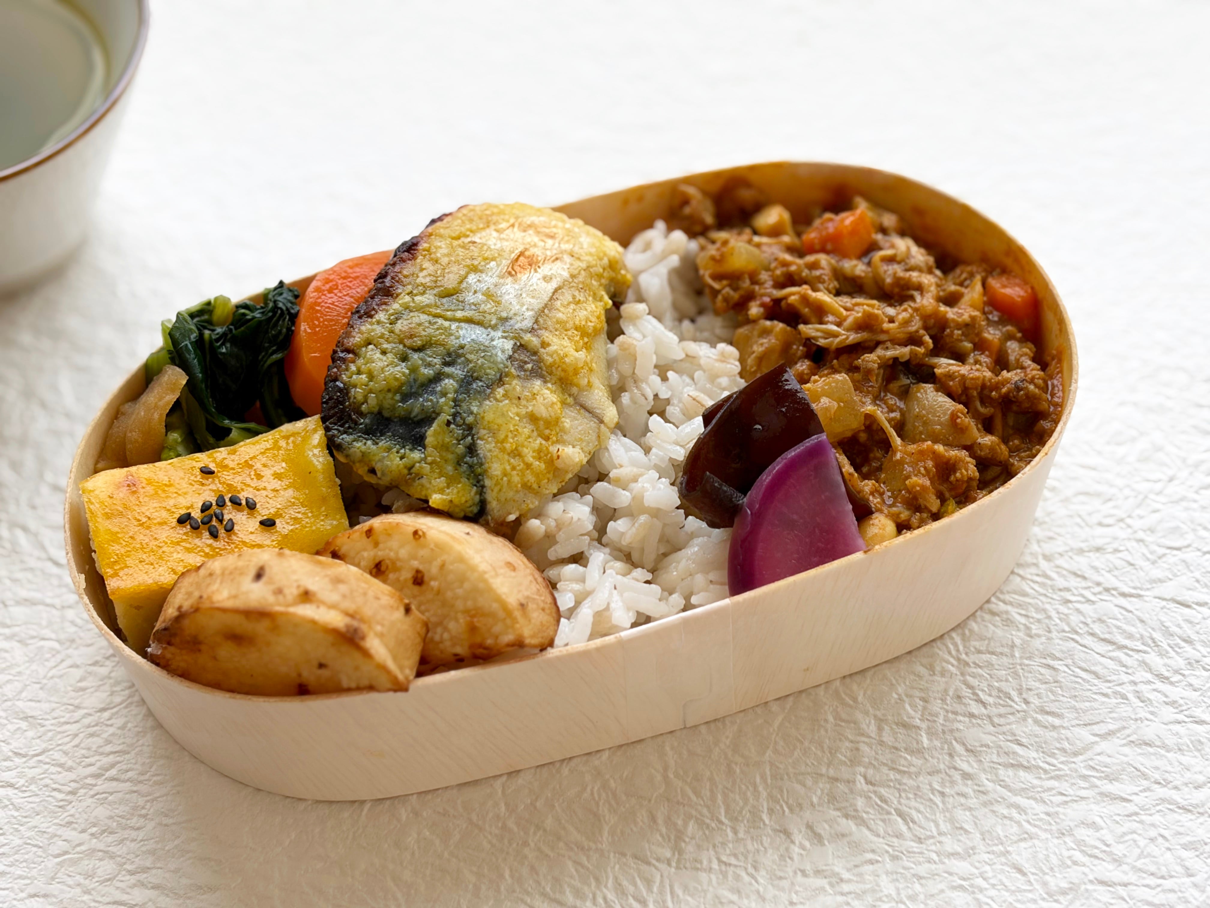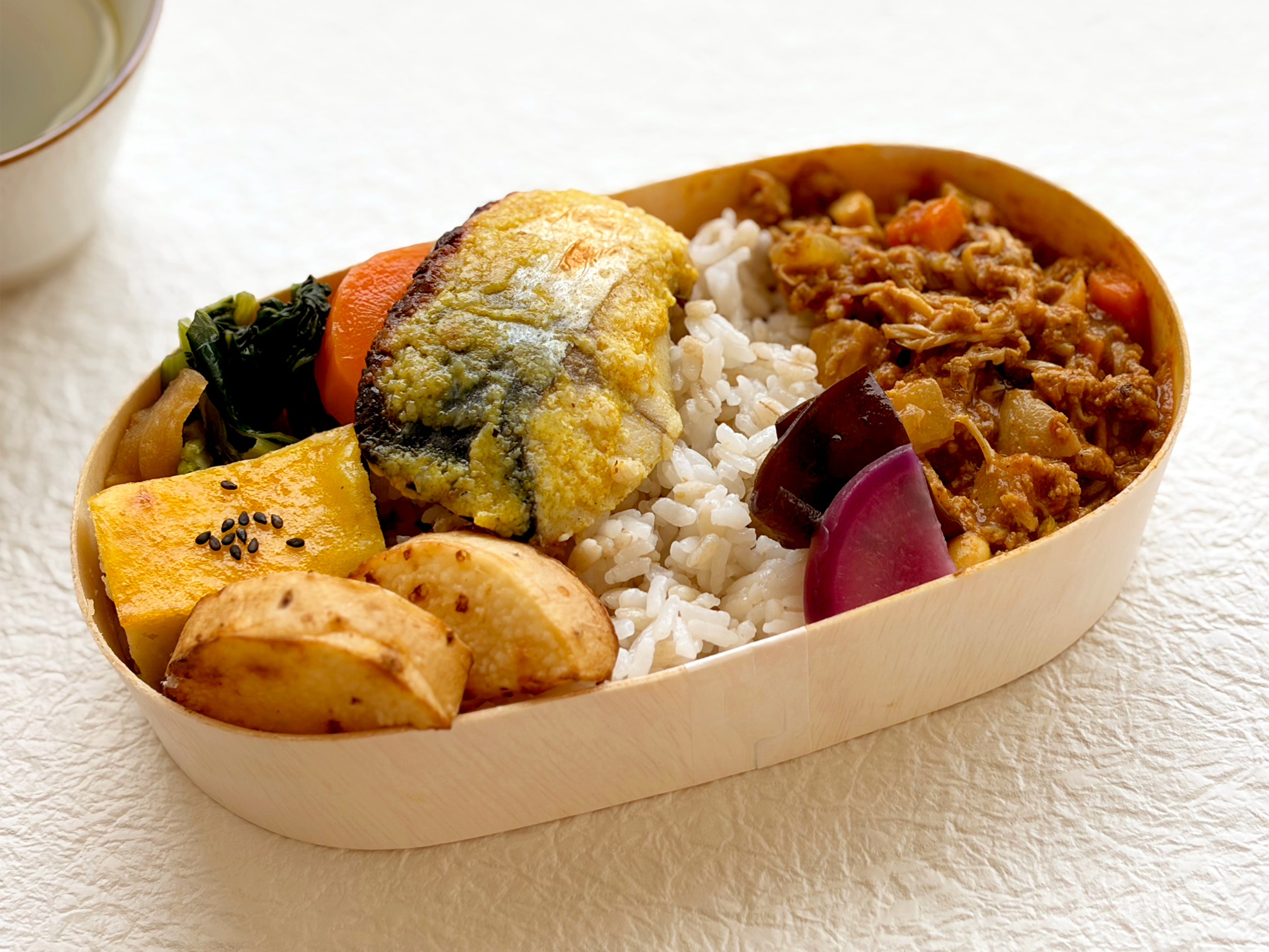 麦ごはん(精白米(国産)、精白麦(国産))、カレールー(豚ひき肉、有機トマト・ジュース漬け、たまねぎ、にんじん、えのきたけ、エリンギ、ごぼう、だいこん、じゃがいも、調合みそ、れんこん、塩麹、乾燥大豆、植物性カレールゥ、にんにく、しょうが、食塩、香辛料)、タンドリー鯖(塩さば、カレー粉、ヨーグルト、トマトケチャップ、にんにく、食塩、こしょう)、スイートポテト(さつまいも、きび糖、牛乳、鶏卵、バター)、小松菜と干し大根の含め煮(こまつな、干し大根、かつお・昆布だし、みりん、うすくちしょうゆ、ごま油)、大根煮(だいこん、かつお・昆布だし、こいくちしょうゆ、みりん、きび糖、ごま油)、椎茸と木耳佃煮(乾燥しいたけ、きくらげ、しょうが、きび糖、みりん、こいくちしょうゆ、清酒)、人参のバターグラッセ(にんじん、粒マスタード、きび糖、バター、食塩)、酢の物(紫大根、穀物酢、きび糖、食塩)、(一部に小麦・卵・乳成分・ごま・さば・大豆・豚肉を含む)
